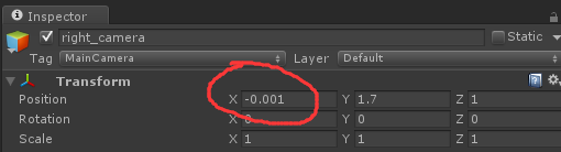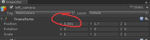 1. 在場景裏放置兩個攝像機分別設(shè)置為left_camera right_camera並把這兩個相機的X軸偏移一定的距離,一(yī)般為0.06-0.10 具體視情況(kuàng)設置,這個距離是表示兩眼(yǎn)的視差距離,太(tài)小了會導(dǎo)致(zhì)立體不(bú)明顯, 太大會導致無法聚焦,或者對眼,眼睛會酸脹。當目標離相機比較近時,這個(gè)值要求也比較小, 例如本例中設置了0.001。